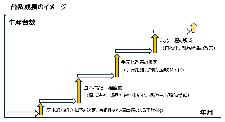 - 工程が安定した段階での人員投入による生産能力の引き上げ